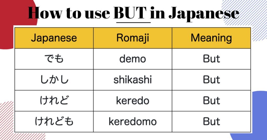 In Japanese, “demo” (でも) is a versatile word that is commonly used to mean “but” or “however” in a sentence. It is often used to introduce contrasting information or to indicate a shift in the topic being discussed.